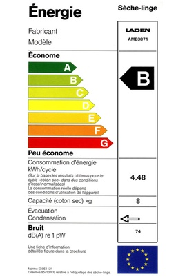 L’AMB3871 a une capacité de 8 kg (coton) ou 4 kg (synthétique). De classe énergie B, sa consommation électrique est dans la moyenne des sèches-linge à condensation récents. Le temps de séchage pour une charge pleine est en moyenne de 2h.